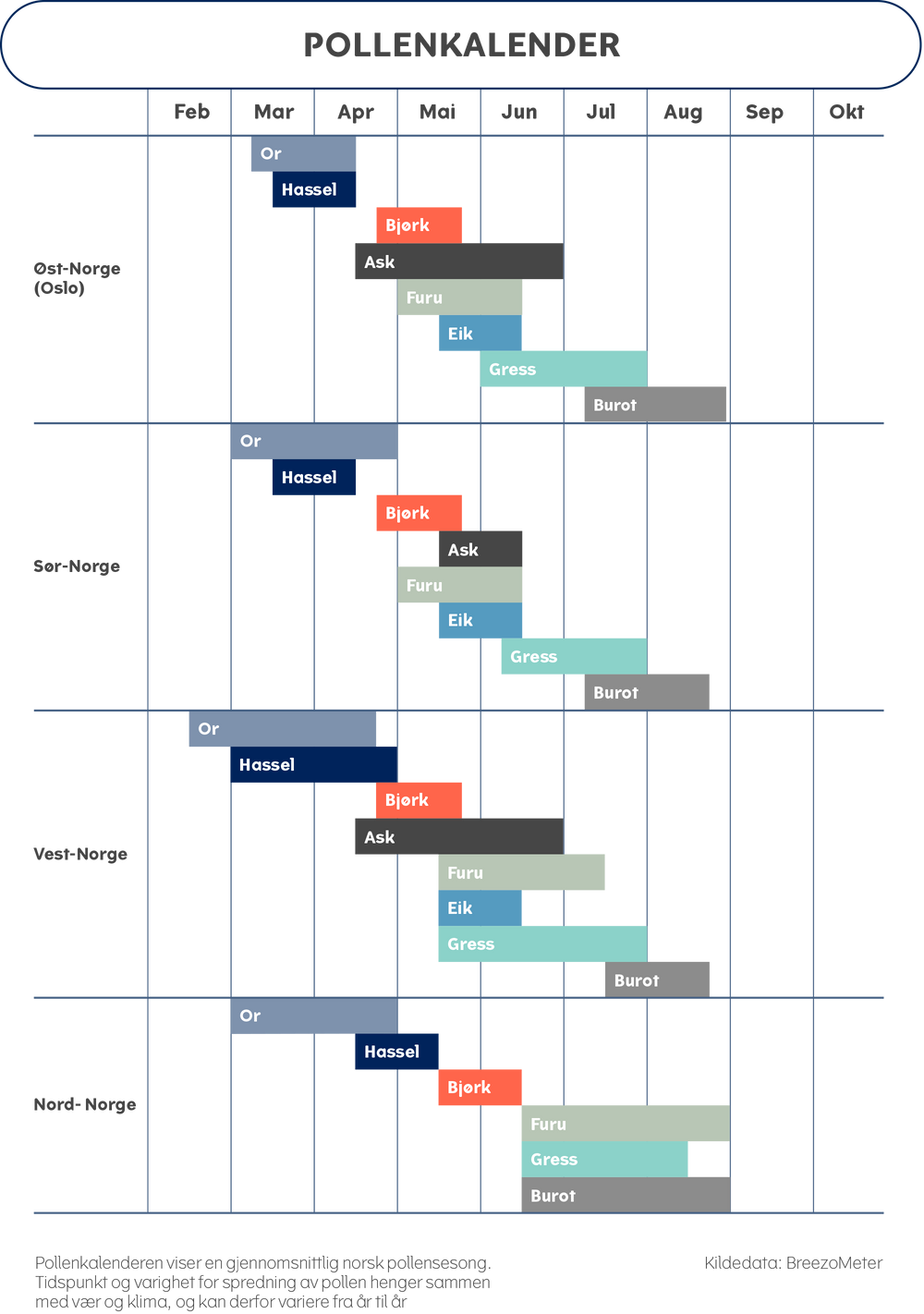 I enkelte år kan pollensesongen starte med tidlig blomstring av or eller hassel i januar¹ og avsluttes med burot eller gresspollen i august².